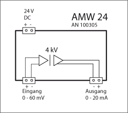 Der AMW bzw. AMWIR ist ein Gleichspannungs-Trennverstärker mit großer Trennspannung.Spannungsversorgung 24 V DC.