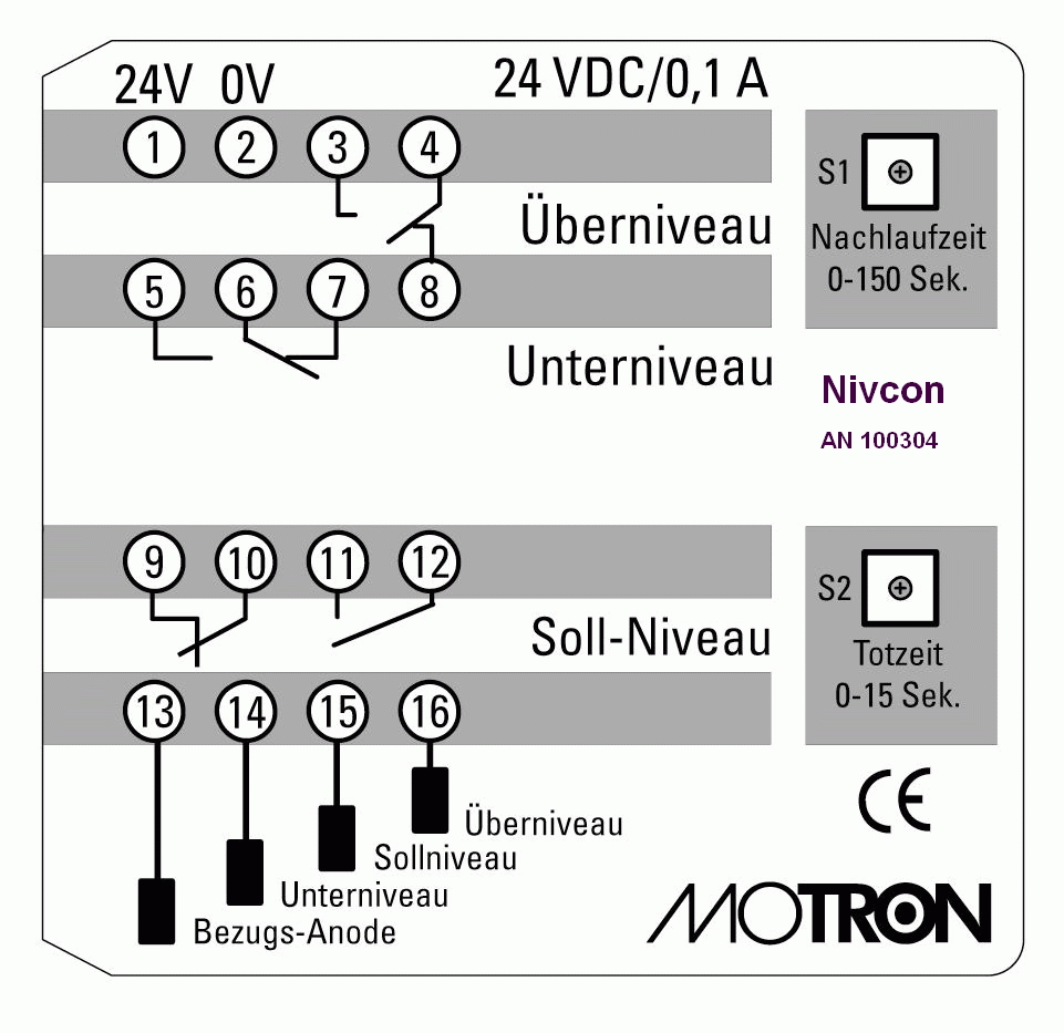 Ventil (S) schaltet ein („S“-LED leuchtet), wenn Spannung ein ist, aber Soll-Niveau-Anode nicht mit Flüssigkeit umspült wird (Schließer). Wenn die Soll-Niveau-Anode mit Flüssigkeit umspült wird, beginnt die Nachlaufzeit abzulaufen. Nach dieser Zeit schaltet das Soll-Niveau-Relais ab. Mit der Zeit wird die Hubhöhe festgelegt. Diese wird mit dem Potentiometer „T“ von ca. 5 s bis ca. 50 s eingestellt. Das Ober-Niveau-Relais (O) fällt ab („O“-LED leuchtet), wenn keine Versorgungsspannung anliegt oder die Ober-Niveau-Anode mit Flüssigkeit umspült wird. Sicherheit über Relais-Schließer!