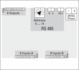 With ExX the user enjoys the opportunity through an RS 485 field bus up to 32 modules, each with 16 – to connect inputs and 8 outputs.