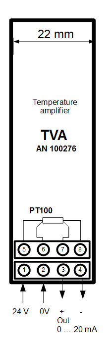 The TVA a transducer for a Pt100 temperature sensor. PT 100 is shot as a four-wire and operated by the device with approx. 2.2 mA constant current. The device has a broken wire detection, monitoring the connected sensor.