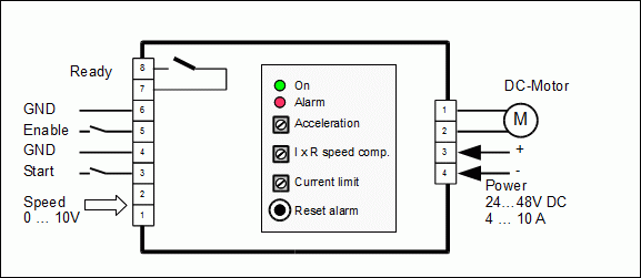 Start on input 0 – 10V corresponding to 0 – 100% speed